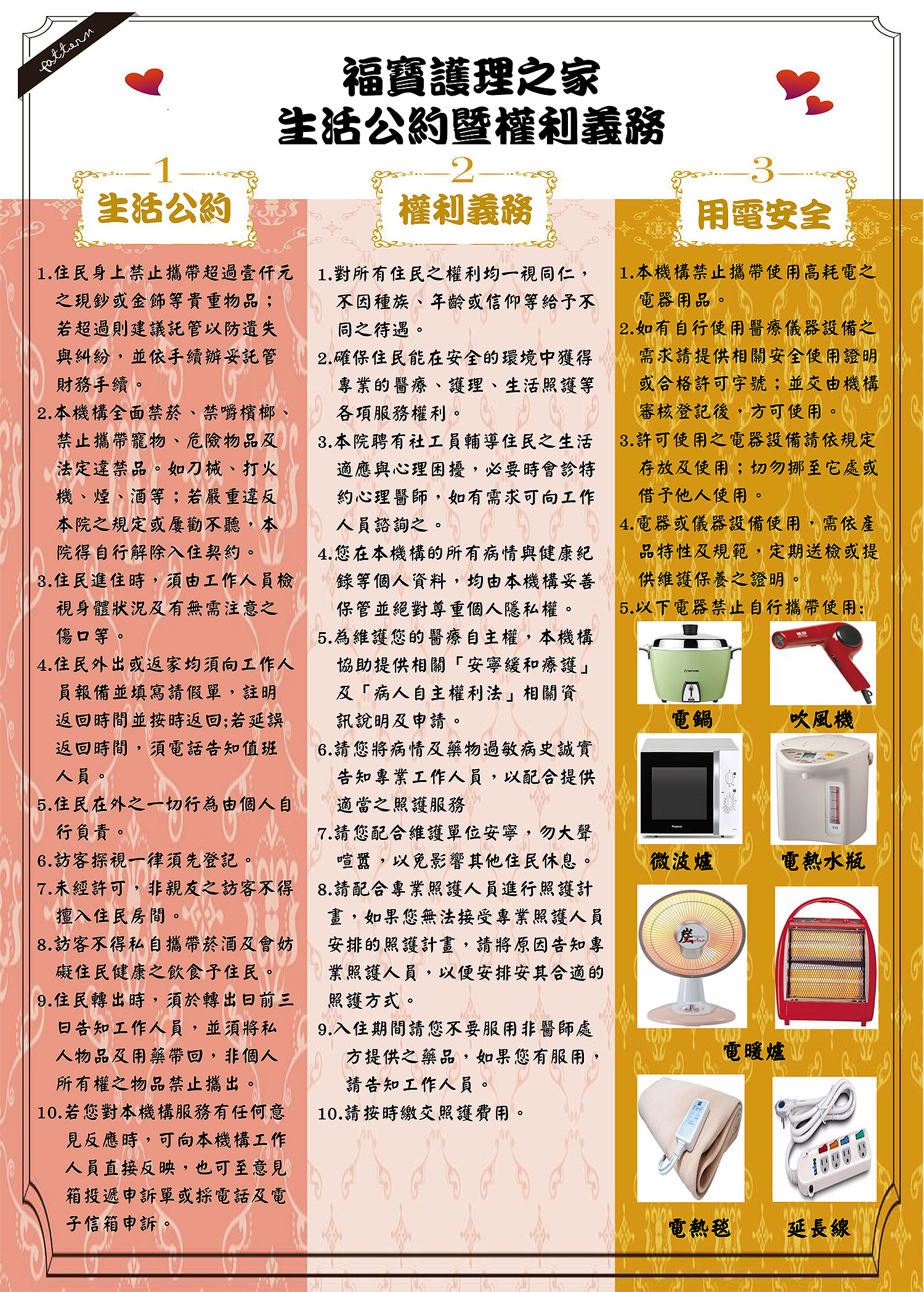 - 證 件:健保卡、身心障礙手冊、住民身分證正本、二位簽約家屬身分證正本、印章